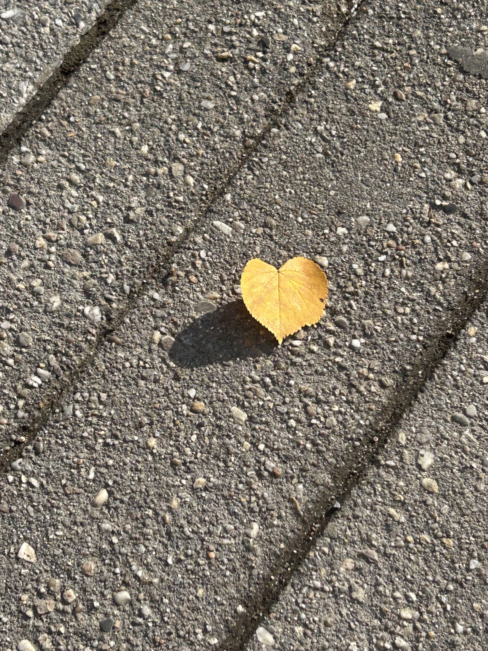 Maar nadat ik was uitgestapt en straat had overgestoken, voelde ik dat de zon moeite deed om te schijnen. En tijdens het wandelen over het plein dwarrelde het eerste blaadje in mooie warme gele herfsttinten voor me naar beneden. Toen ik naar het blaadje op de grond keek, zag ik dat het leek op een klein warm geel hartje. Dit warme gele herfstblaadje zorgde ervoor dat mijn dag minder somber werd. Het herinnerde me eraan dat de herfst ook vele mooie en gezellige kanten heeft. Het was een klein geluksmomentje dat de rest van mijn dag zonniger maakte.